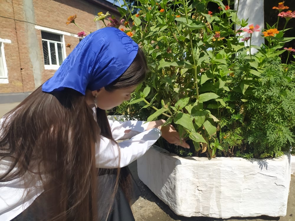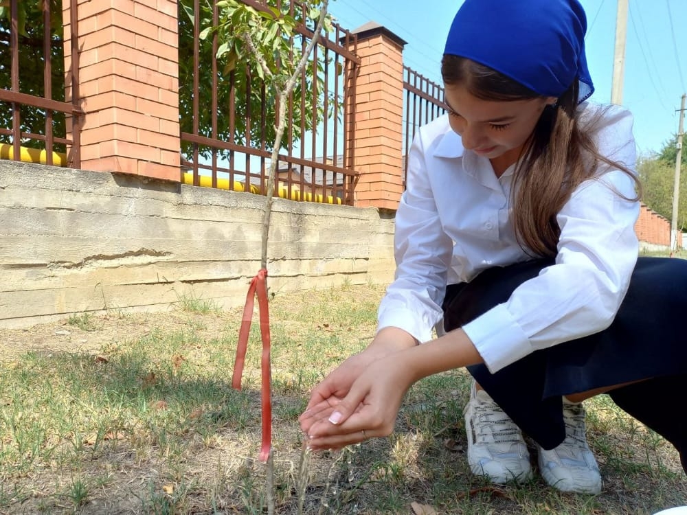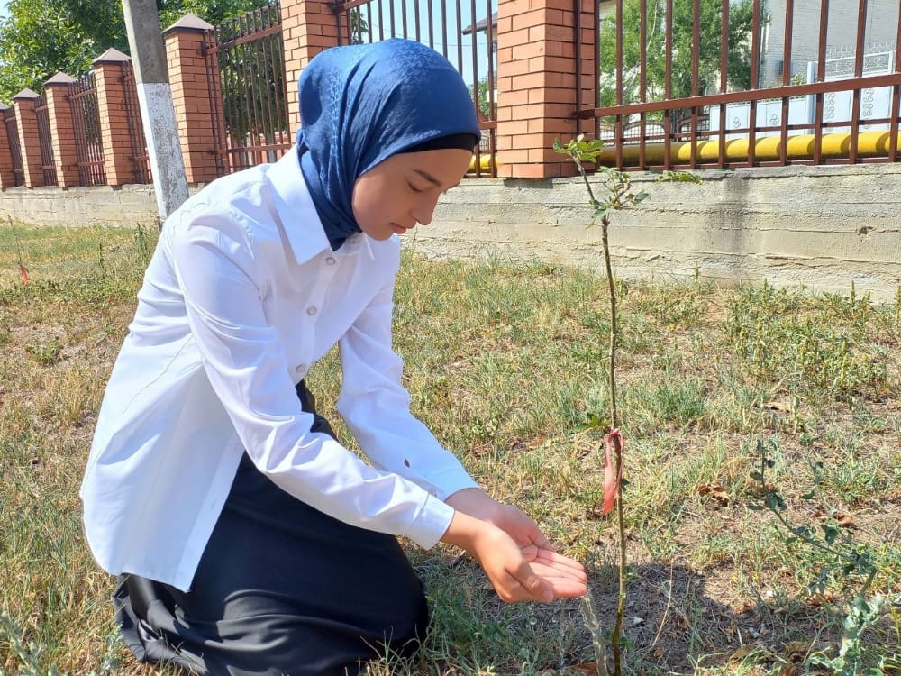 Участники акции набирали воду из чаши в ладони и поливали из рук цветы, деревья, рядом с прилежащими территориями школы – таким образом символически делились водой с теми, кого уже нет.