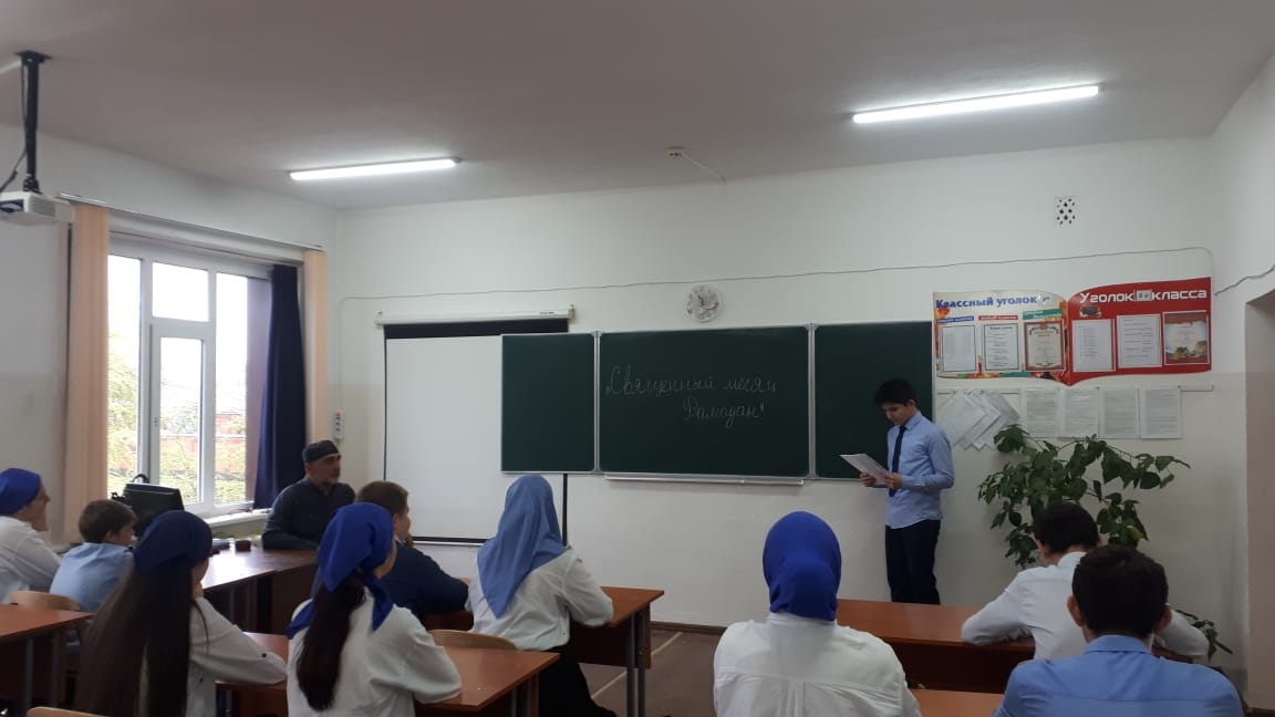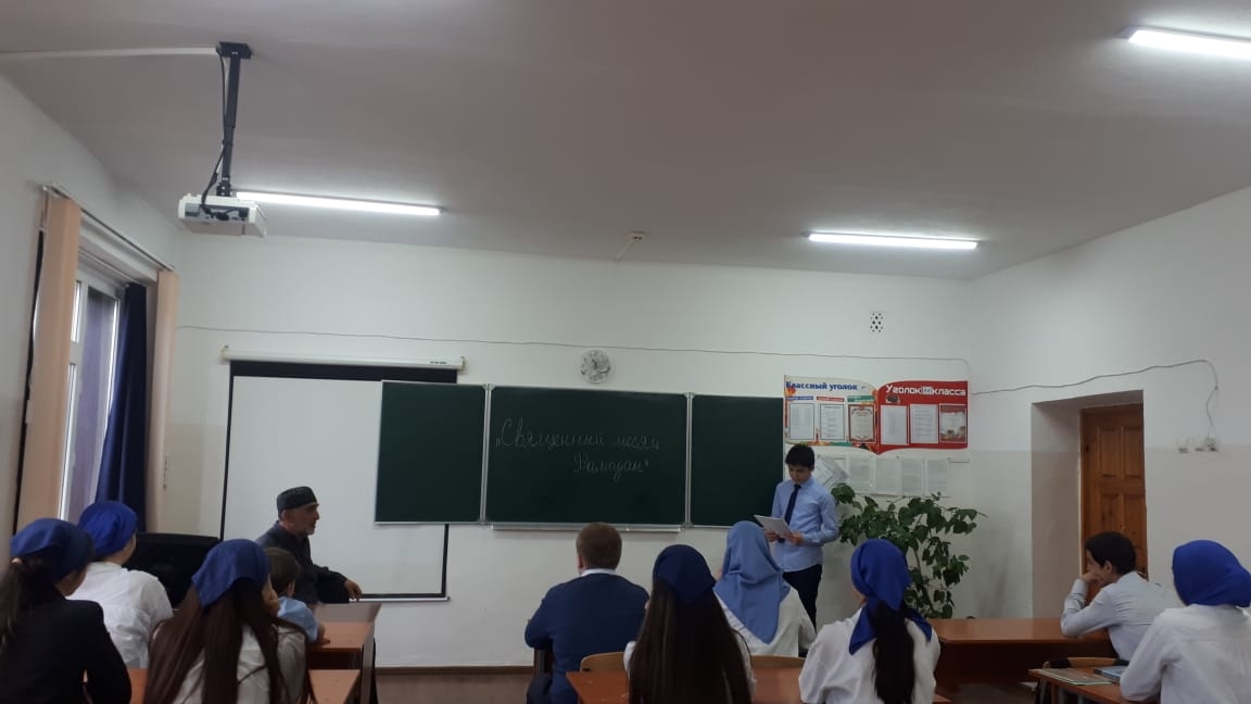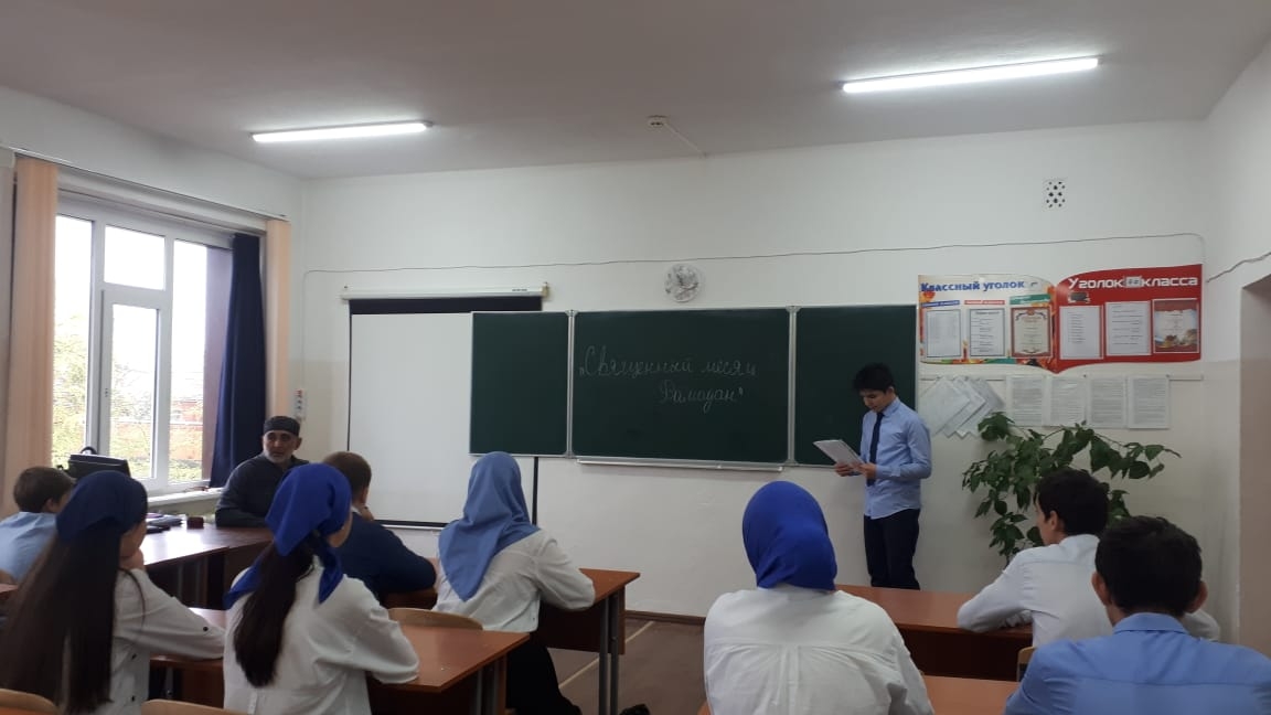 13 апреля 2023 года педагогом организатором Азарсановым С.М. совместно с ЧРОО ЕДЮО "Юные Кадыровцы" проведена беседа с учащимися 9 б класса на тему: "Священный месяц Рамадан".