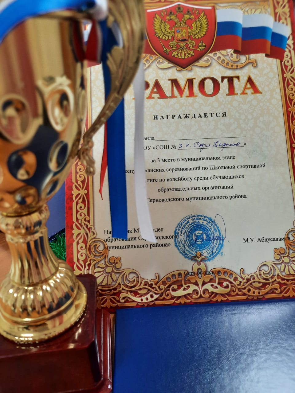 6 декабря 2023г. сборная по волейболу МБОУ "СОШ №3 с. Серноводское" Серноводского муниципального района завоевала 3 место в муниципальном этапе Республиканских соревнований по волейболу среди сборных команд района.