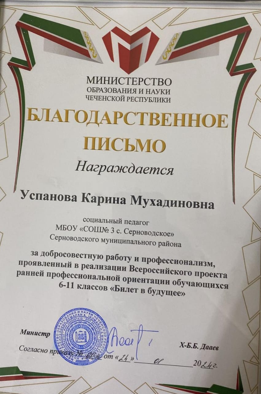 Благодарственным письмом МОН ЧР за добросовестную работу и профессионализм, проявленный в реализации Всероссийского проекта ранней профессиональной ориентации обучающихся 6-11 классов "Билет в будущее" награждена сегодня, 25 января 2024г., социальный педагог МБОУ "СОШ №3 с. Серноводское" Серноводского муниципального района Успанова Карина Мухадиновна.