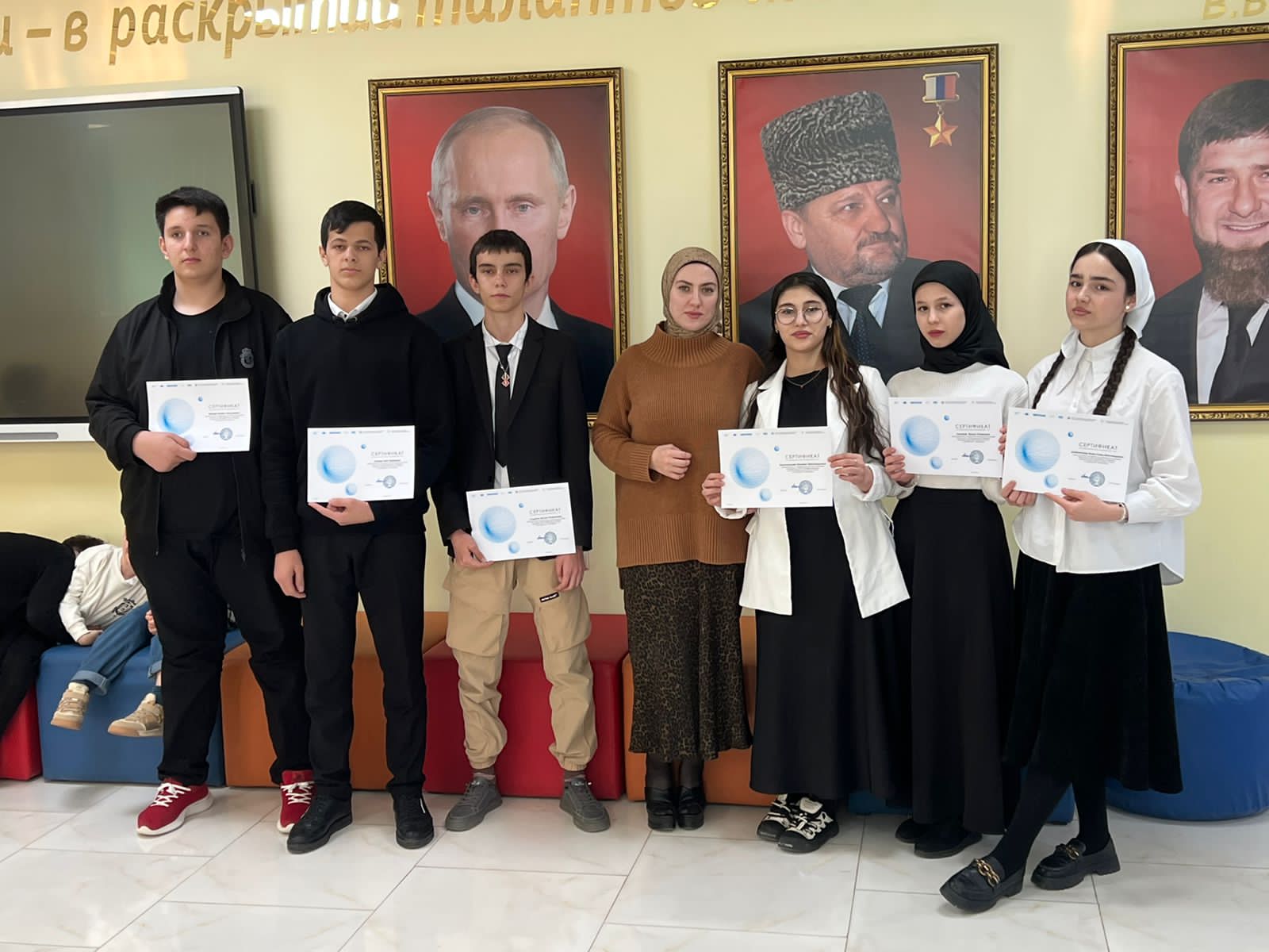 Победительницы муниципального этапа Всероссийской олимпиады школьников 2023-2024 уч. г. по математике, обучающиеся 10 класса МБОУ "СОШ №3 с. Серноводское" Серноводского муниципального района, Заматханова Петимат и Лечиева Элиза прошли обучение по профильной олимпиадной программе и получили сертификаты.