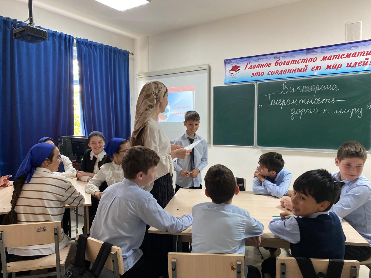 24 апреля 2024 года в рамках проведения в школе недели психологии с учащимися 6 класса проведена Викторина на тему «Толерантность - дорога к миру». Цель - познакомить учащихся с понятием «толерантность», с основными чертами толерантной личности; развить способности адекватно и полно познавать себя и других людей.