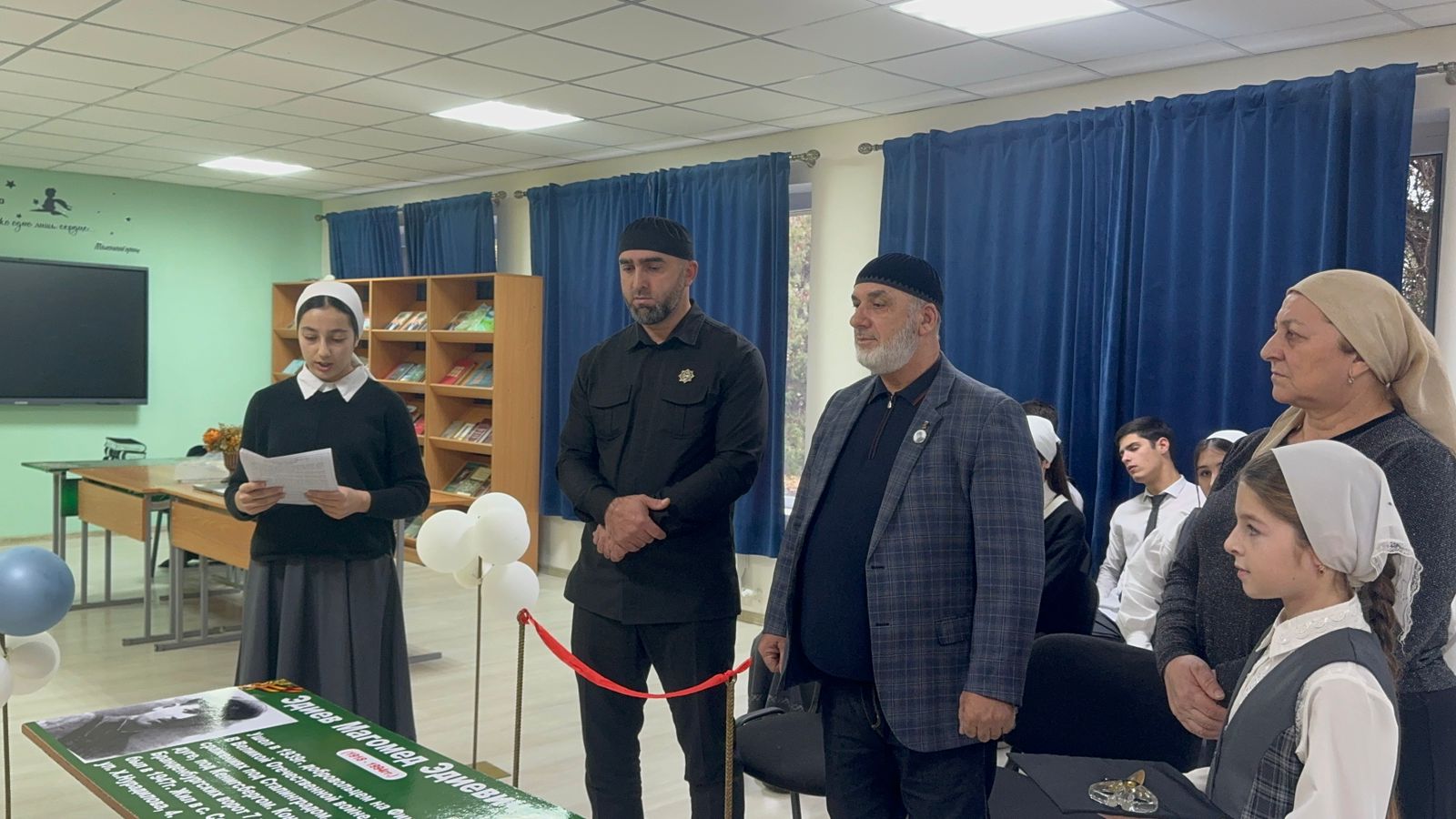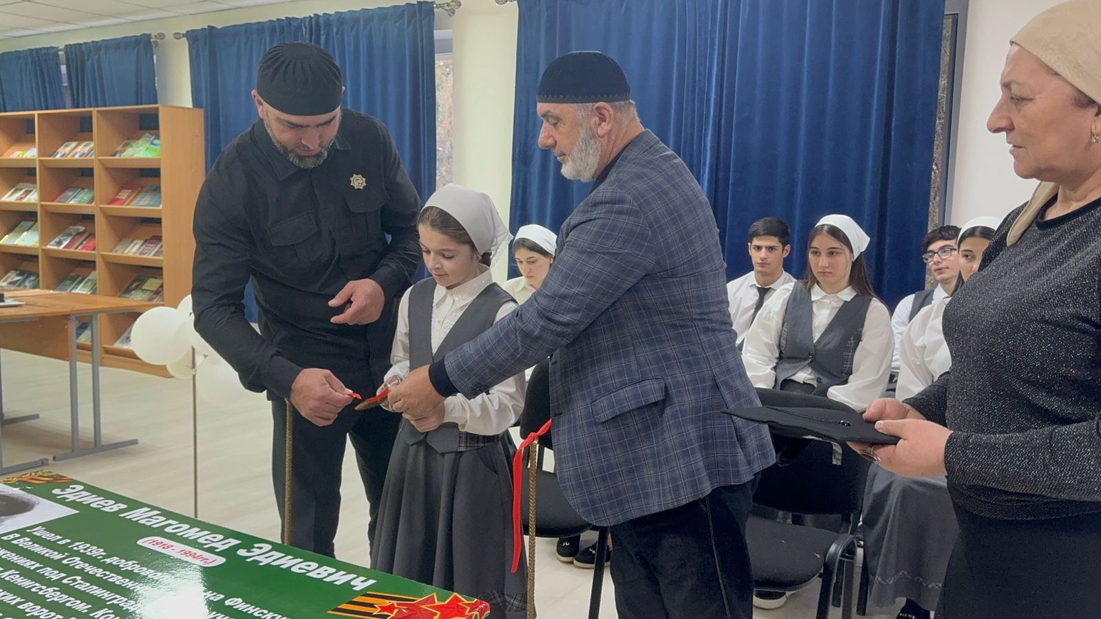 «Сегодня в нашей школе прошла торжественная церемония открытия «Парты Героя» – Эдиева Магомеда Эдиевича, который ушел в 1939г. добровольцем на Финскую войну. В Великой Отечественной войне участвовал в сражениях под Сталинградом, на Орловско-Курской дуге, под Кенигсбергом. Конец войны встретил у Бранденбургских ворот 7 мая 1945г. Был демобилизован в 1947г.» - подчеркнул Али Заиндиевич.